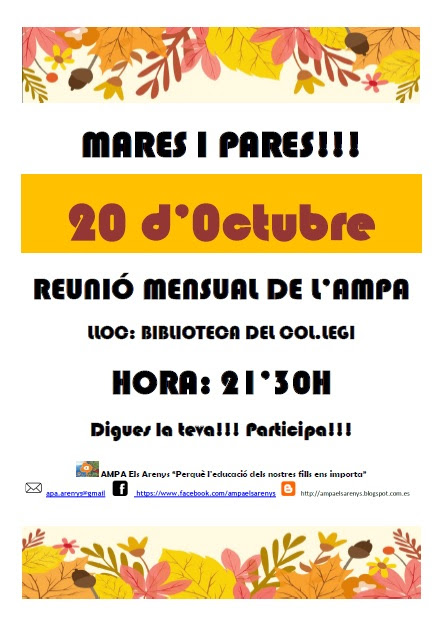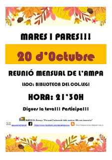 No ens cansarem mai de recordar-vos que us esperem a les reunions mensuals de l'AMPA. Hi prenem decisions que ens afecten a tots i, quants més siguem, millor estaran representats tots els punts de vista.